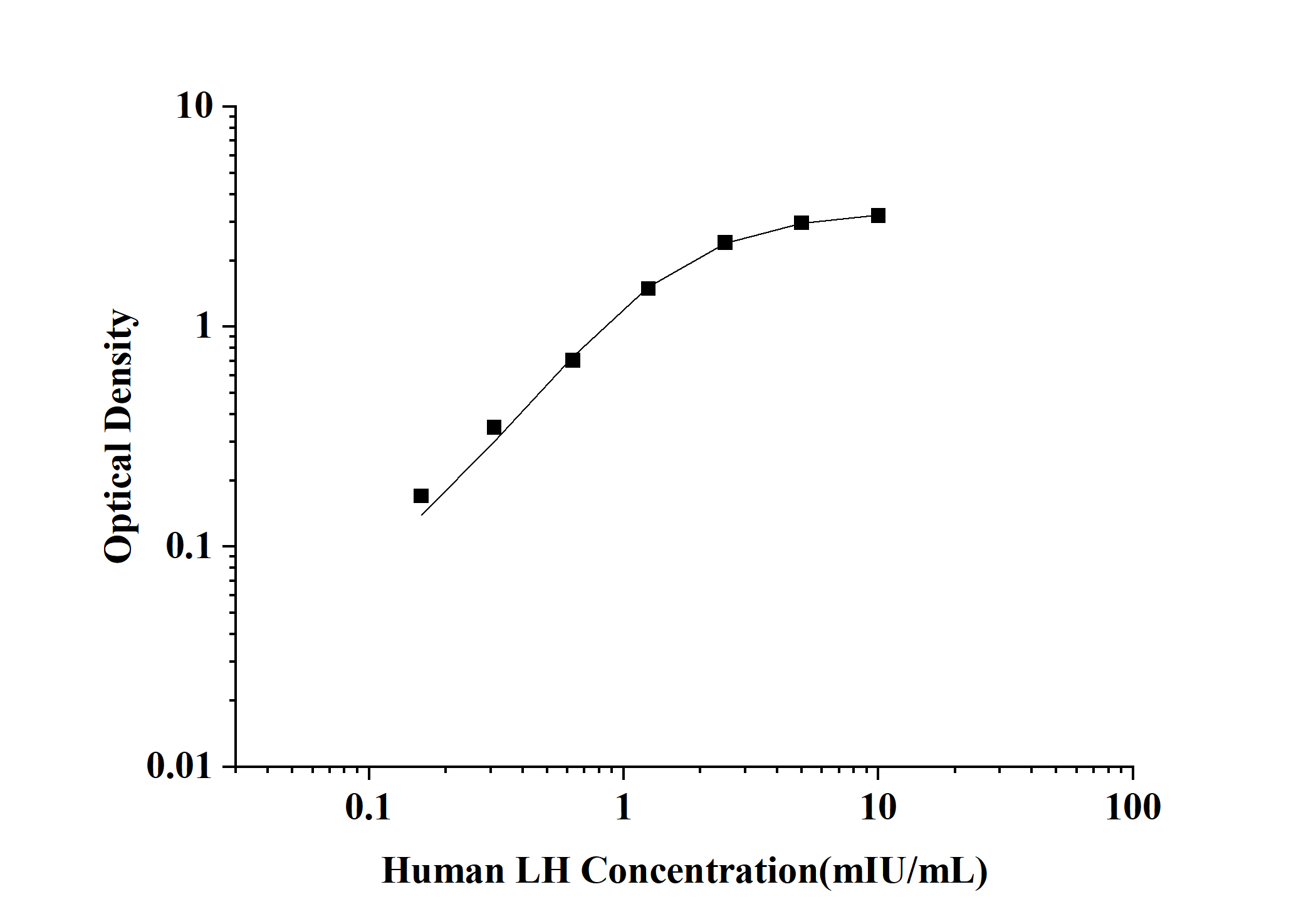 | 测试原理 | 本试剂盒采用双抗体夹心ELISA法。用抗人 LH抗体包被于酶标板上,实验时样品或标准品中的人 LH会与包被抗体结合,游离的成分被洗去。依次加入生物素化的抗人 LH抗体和辣根过氧化物酶标记的亲和素。抗人 LH抗体与结合在包被抗体上的人 LH结合、生物素与亲和素特异性结合而形成免疫复合物,游离的成分被洗去。加入显色底物(TMB),TMB在辣根过氧化物酶的催化下呈现蓝色,加终止液后变成黄色。用酶标仪在450nm波长处测OD值,人 LH浓度与OD450值之间呈正比,通过绘制标准曲线计算出样品中人 LH的浓度。 | ||