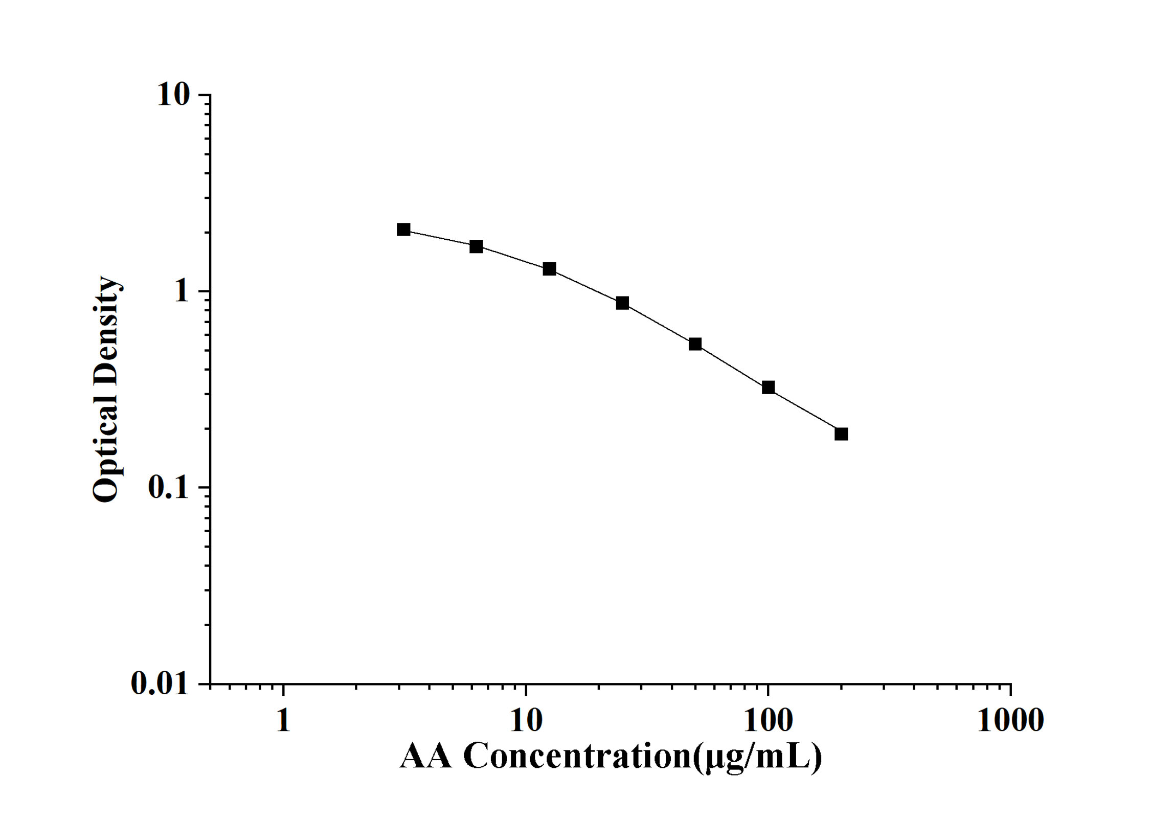 | 测试原理 | 本试剂盒采用竞争ELISA法。用AA抗原包被于酶标板上,实验时样品或标准品中的AA与包被的AA竞争生物素标记的抗AA单抗上的结合位点,游离的成分被洗去。加入辣根过氧化物酶标记的亲和素,生物素与亲和素特异性结合而形成免疫复合物,游离的成分被洗去。加入显色底物(TMB),TMB在辣根过氧化物酶的催化下呈现蓝色,加终止液后变成黄色。用酶标仪在450nm波长处测OD值,AA浓度与OD450值之间呈反比,通过绘制标准曲线计算出样品中AA的浓度。 | ||