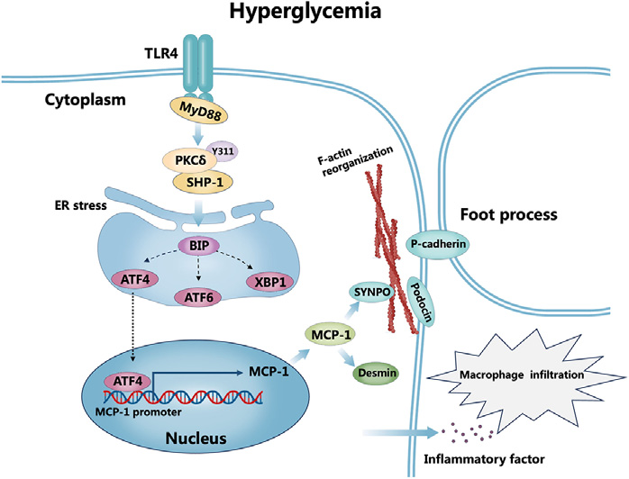 本研究探讨了Toll样受体4(TLR4)在糖尿病足细胞损伤中的调控作用及机制。研究发现,在高糖刺激的足细胞和链脲佐菌素(STZ)诱导的糖尿病肾组织中TLR4表达上调。机制上,高糖激活TLR4/MyD88信号,启动下游PKCδ/SHP-1信号级联,引发内质网应激和炎症因子MCP-1释放,导致足细胞 slit diaphragm(SD)结构损伤、细胞骨架破坏和炎症反应。足细胞特异性敲除TLR4可通过阻断上述异常减轻足细胞损伤和蛋白尿,证实了TLR4/MyD88/PKCδ/SHP-1轴在糖尿病肾病中的关键作用,为靶向TLR4治疗提供了理论依据。