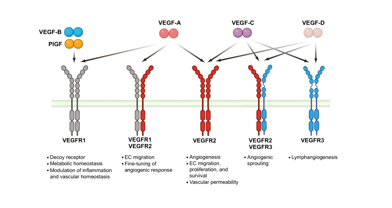 超过90%的VEGF相关研究聚焦于VEGF-A,包括抗VEGF疗法(如贝伐珠单抗、雷珠单抗)均靶向VEGF-A。 |