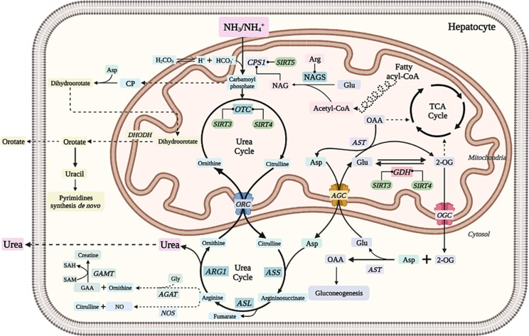 从氨气(左上)到尿素(左下),会经历一个复杂的代谢循环过程