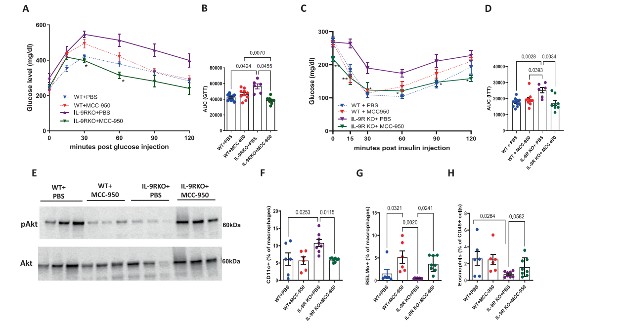 【图4】 抑制NLRP3信号可改善IL-9R 敲除小鼠的代谢与炎症状态。
