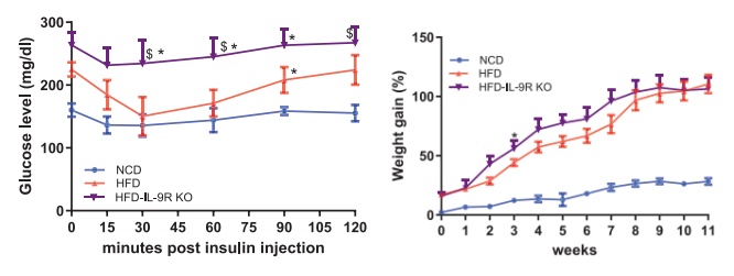 【图2】 IL-9R缺失在高脂饮食(HFD)喂养期间加剧代谢恶化。