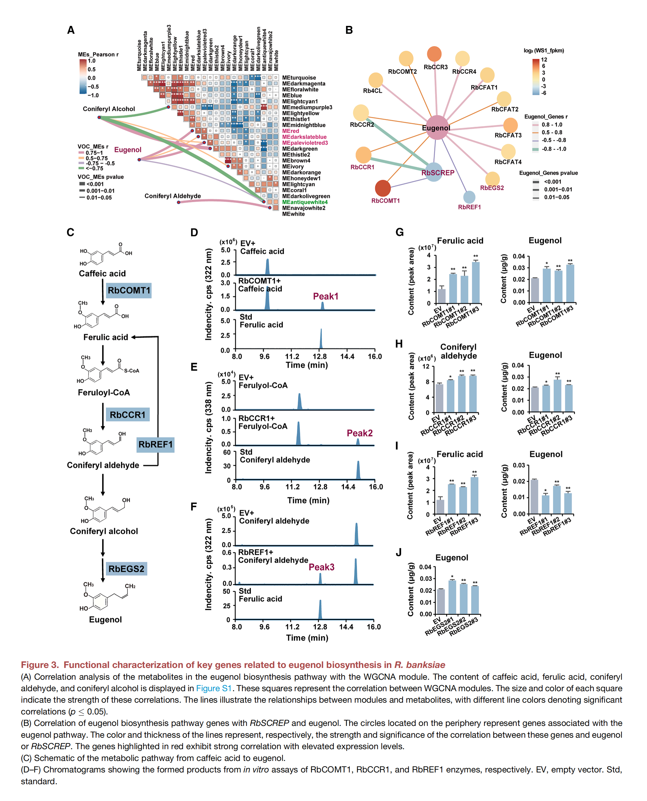 图3|丁香酚合成通路关键酶(COMT1、CCR1、REF1、EGS2)体外活性与转基因验证。来源:原PDF Figure 3,第6页。