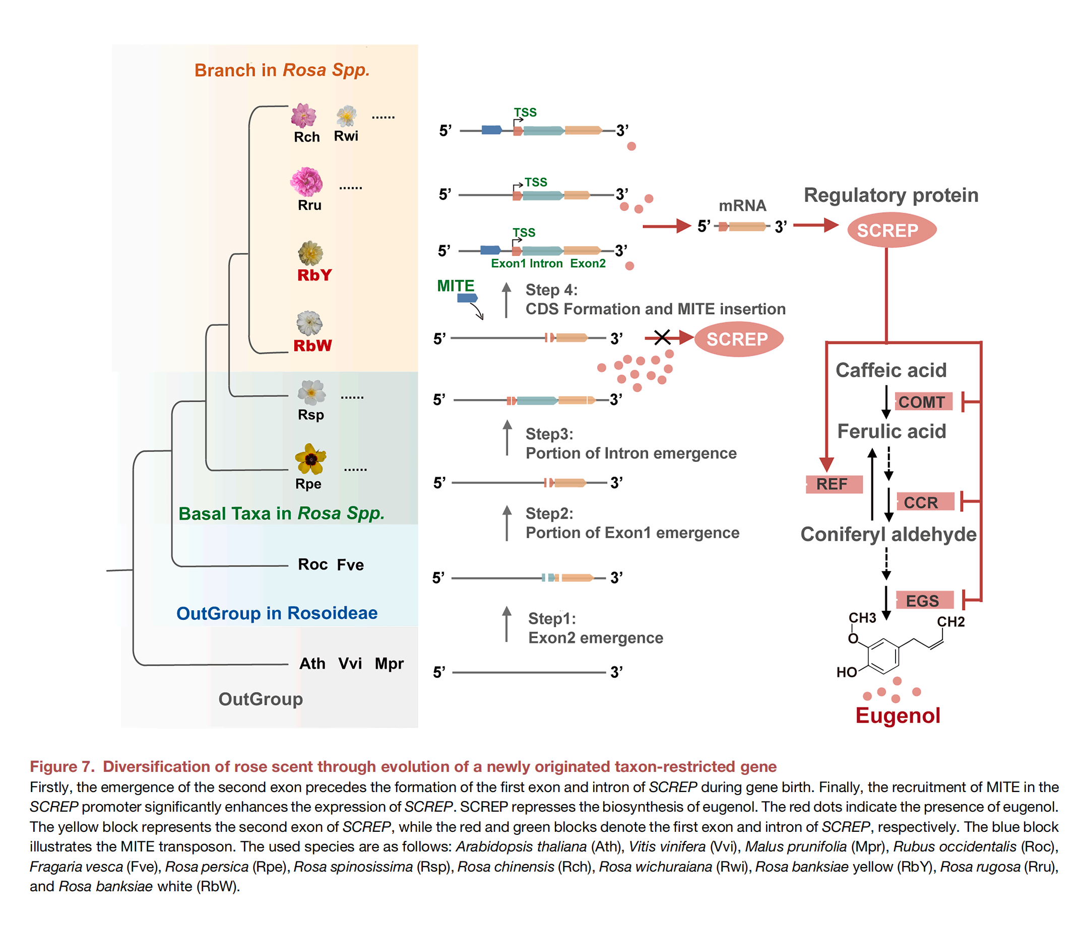 4. 多样性驱动:SCREP基因在不同玫瑰物种中的存在与否,以及其调控强度的差异,直接导致了不同玫瑰品种间丁香酚含量和香气的巨大差异,从而驱动了玫瑰香味的多样化。