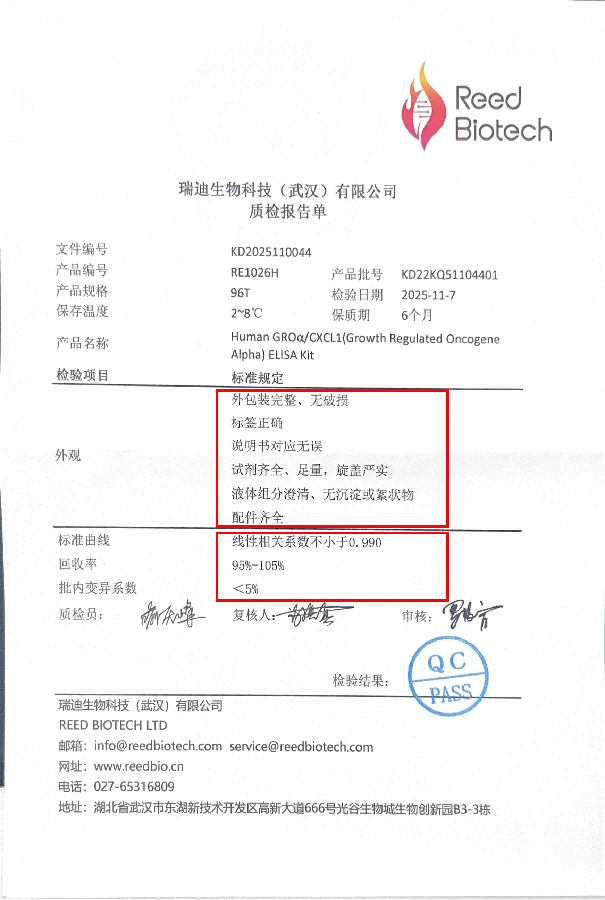 ELISA试剂盒内的质检报告单,表明该试剂盒在出厂前满足外观完整、组分齐全、无变质等标准规定,且符合标曲线性良好(R2≥0.99)、批内差小(<10%)等性能要求,保证各位研究员收到的试剂盒符合标准。