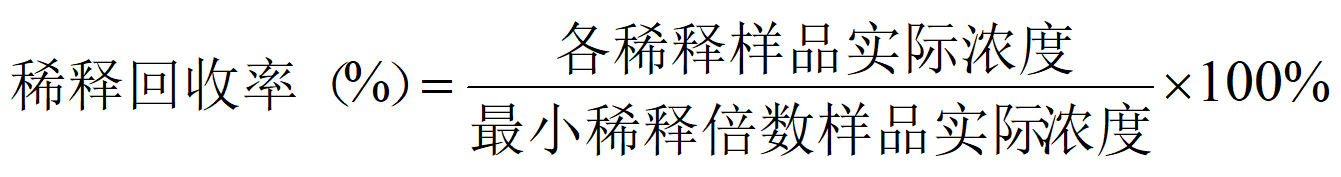 将含有或添加有高浓度待检物的样本进行多个梯度稀释(稀释前后的样本均应在试剂盒检测范围内),稀释后的样本浓度与未稀释(稀释倍数为1)样本浓度的比值即为稀释回收率。稀释回收率可排除样本基质、钩状效应、稀释手法的干扰。通常进行血浆、血清和细胞培养基的稀释回收率测试。稀释回收率在80~120%之间即为合格。
