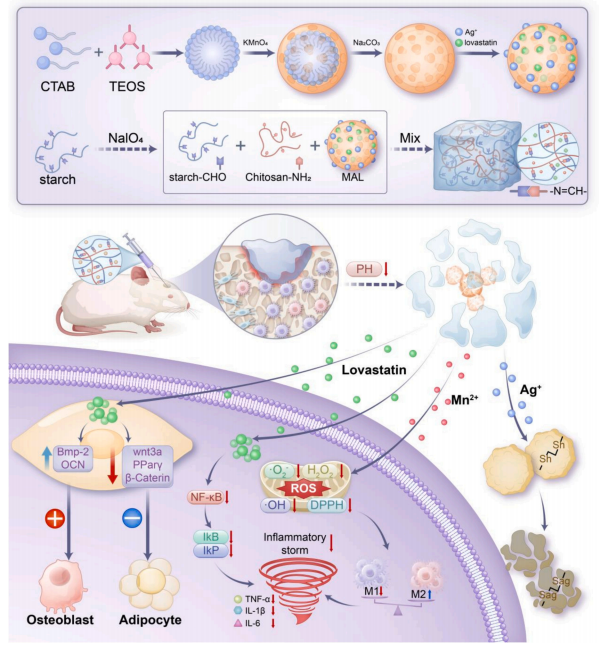 感染性骨缺损(IBD)本就是骨科和口腔颌面外科的"硬骨头"——细菌生物膜顽固耐药,局部炎症经久不愈,骨再生严重滞后。更棘手的是,越来越多患者合并高脂血(hyperlipidemia):免疫力打折,干细胞"长歪",活性氧(ROS)爆表,骨髓间充质干细胞(BMSCs)不往成骨方向分化,反而大量变成脂肪细胞,炎症-氧化应激-脂质代谢紊乱三重打击,传统"清创+抗生素"方案效果大打折扣。