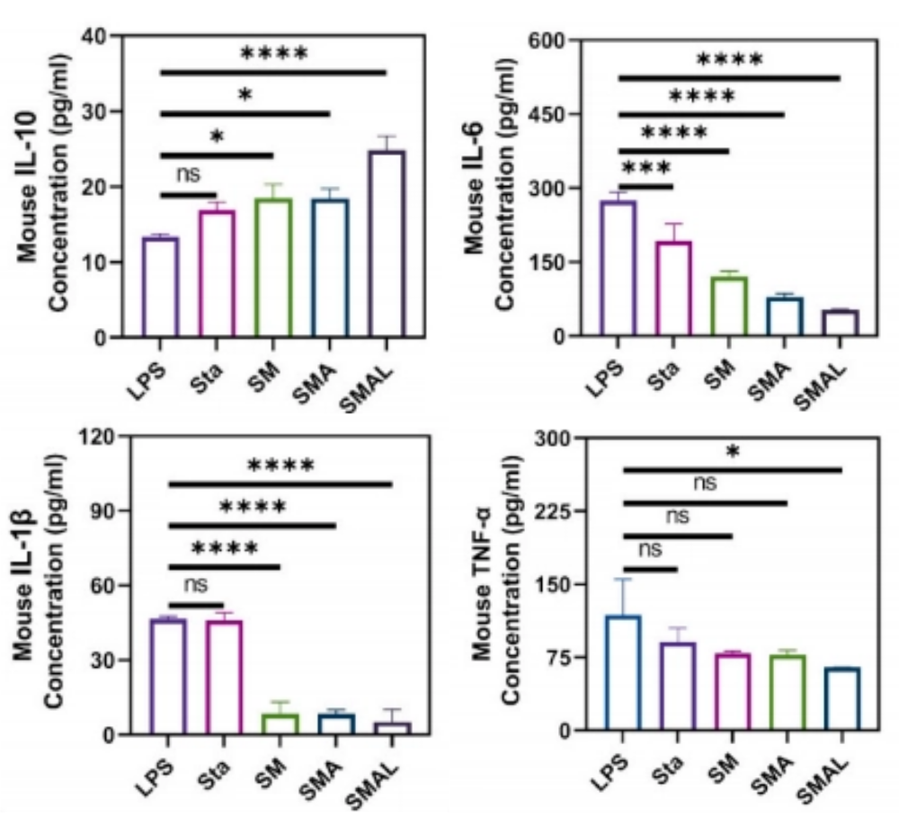 实验室验证对对耐甲氧西林金黄色葡萄球菌(MRSA)的抑菌率超过99%,扫描电镜下可见细菌细胞膜破裂、内容物泄漏。更厉害的是,它能有效破坏细菌生物膜——这可是90%慢性感染的罪魁祸首。在H₂O₂模拟的高氧化应激环境中,SMAL组细胞内ROS水平下降近70%,线粒体功能恢复正常。DPPH自由基清除实验显示其抗氧化能力呈剂量依赖性增强。同时巨噬细胞"改邪归正",ELISA检测发现:促炎因子TNF-α、IL-1β、IL-6显著下降,抗炎因子IL-10明显升高,巨噬细胞从M1型向M2型极化。在高脂环境下,SMAL组ALP活性提升3倍,矿化结节密密麻麻(茜素红染色),而对照组油红O染色满屏脂肪滴。