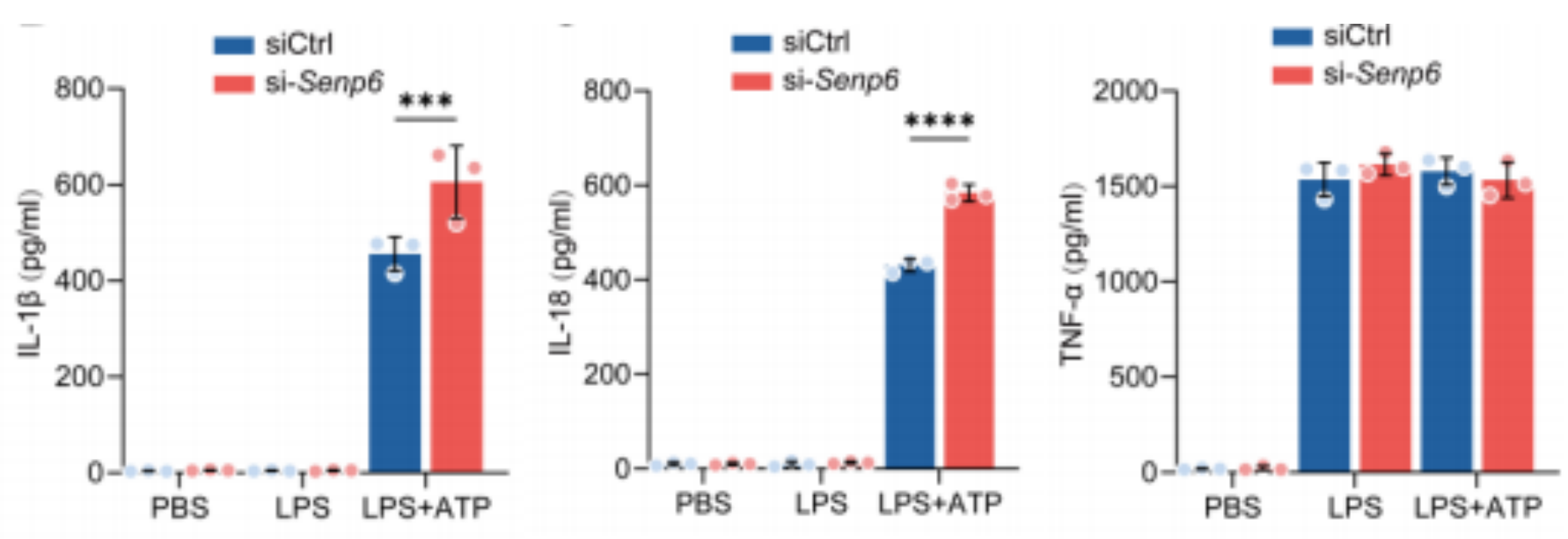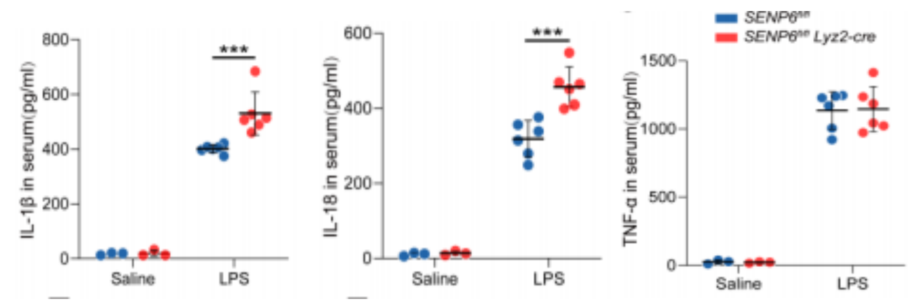 LPS处理+ATP激活后, SENP6fl/fl和SENP6fl/fl Lyz2-cre腹腔巨噬细胞上清IL-1β、IL-18和TNF-α 水平。